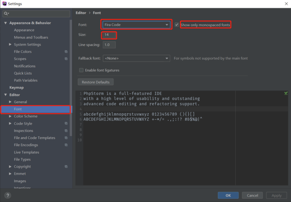 进入Editor > Font项,可以修改代码的字体Font,默认只有PhpStorm自带的几种字体,取消选中Show only monospaced fonts可以选择电脑系统的字体。