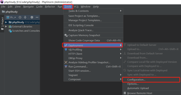 点击上方菜单Tools > Deployment > Configuration...进行配置