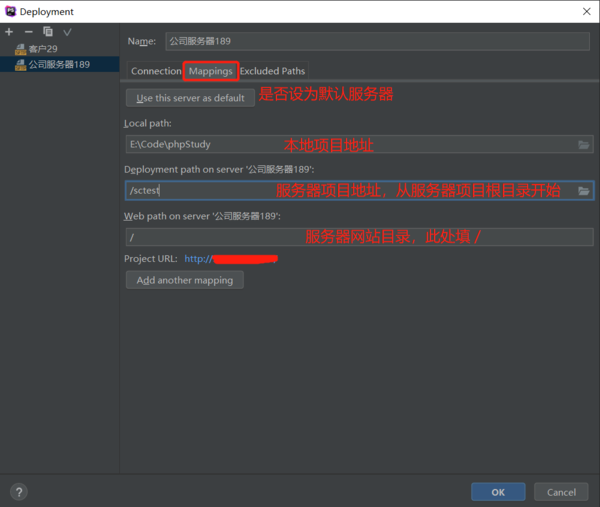 点击Mappings,选择本地项目地址、服务器项目地址(注意这里是从上一步设置的项目根目录开始的)、服务器网站目录地址,并选择设置为默认服务器。