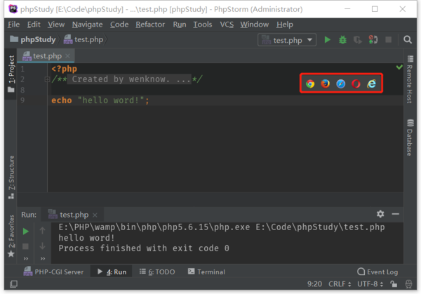 此外,点击代码区域右上角的浏览器图标,可以直接在浏览器中运行PHP代码。