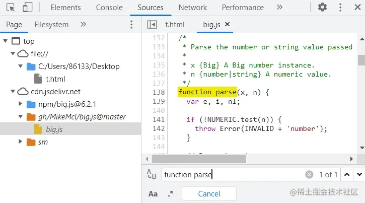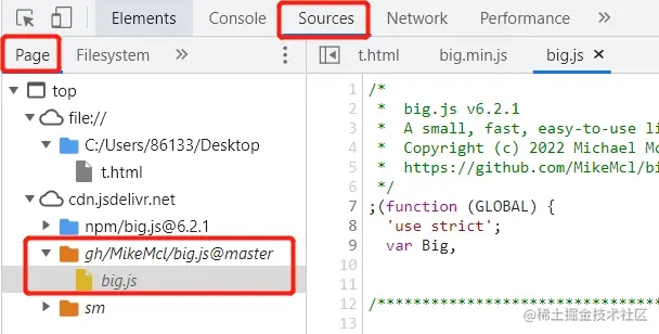 在 Sources 标签的 Page 项里,找到未混淆的代码文件 big.js(xxx.min.js 文件一般是压缩混淆后的代码,可读性不高),这个就是我们要用到的完整源码了。
