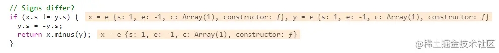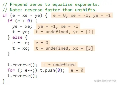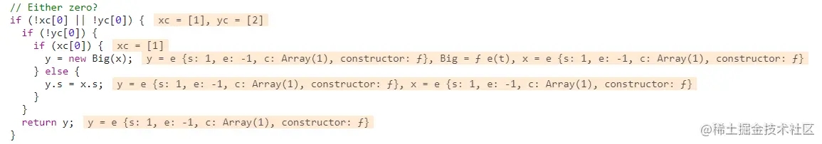if 的判断条件是 !xc[0] || !yc[0],诶,这就用到了步骤 4 的变量了。xc 就是 x 的数字数组(就是 big 实例的 c 属性),yc 同理。这里大家注意一下,经过构造函数调用 parse 解析之后,实际上是已经移除首尾的 0 了,那么 !xc[0] 和 !yc[0] 怎么可能为 true ?那肯定是有段逻辑让它变成了 0 咯,直接看源码,果然被我揪到了。