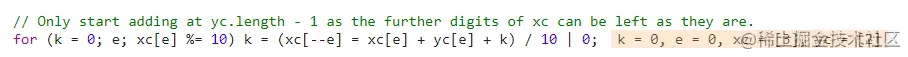 for (k = 0; e; xc[e] %= 10) k = (xc[--e] = xc[e] yc[e] k) / 10 | 0;