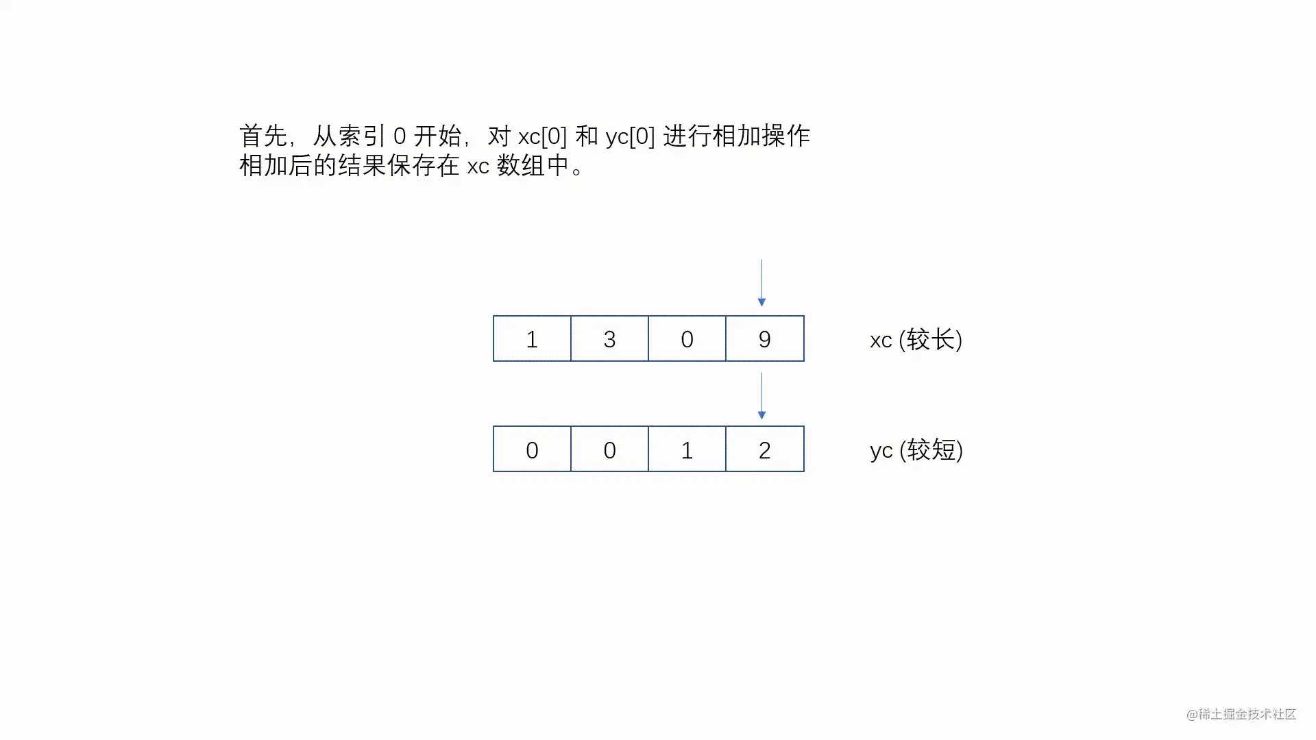 这下大家知道为什么要将 xc 指向较长的数组,而将 yc 指向较短的数组了吧,因为较短的数组前面都是 0,实际上这些 0 都没必要进行相加处理了。