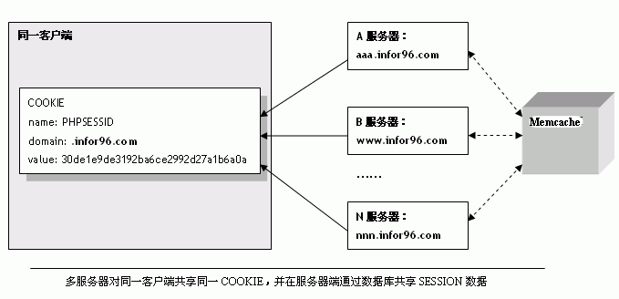 第二个目标的实现可以使用文件共享方式,如 NFS 方式,但设置、操作上有些复杂。我们可以将数据放在memcache中。这样各个服务器就可以方便地访问同一个数据源,获取相同的 SESSION 数据了。