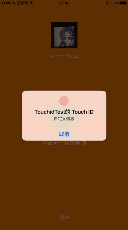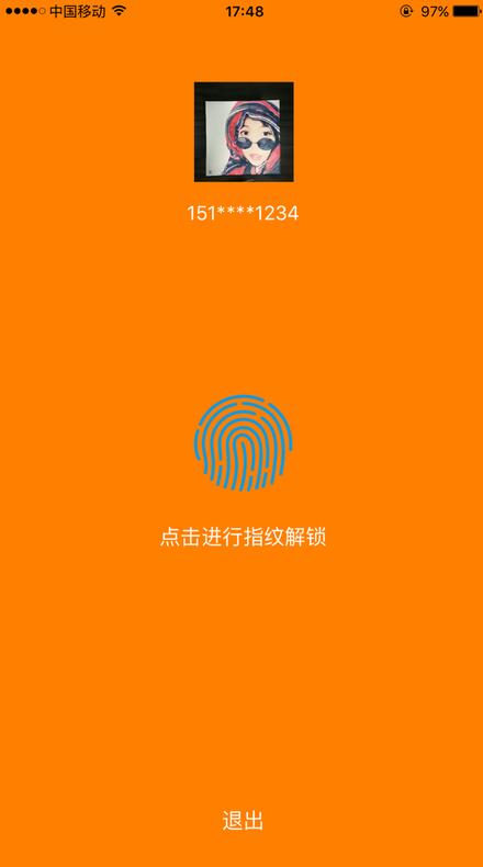 上一篇文章简单的写了对于touchid的简单了解。因为太懒了,就没有写实例,现在就单独写一篇应用吧,这篇想做的就是一个模仿那个叫啥软件来着,某某理财类类的软件的一个指纹验证解锁。我们做出来的页面应该如下图,在app挂起到后台的时候再点击到前台的时候回出现如下页面: