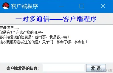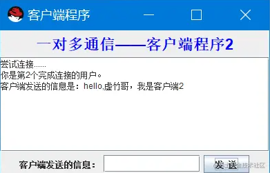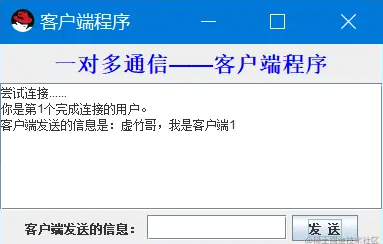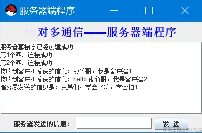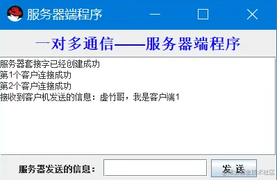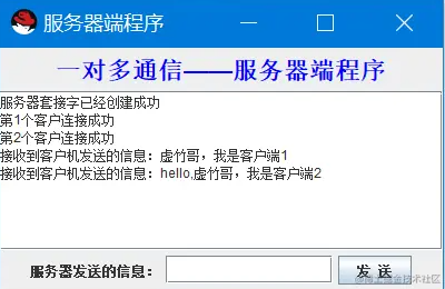题目实现:一个服务器与多个客户端通信。通过一个服务器与多个客户端进行通信,运行程序,服务器启动后,启动两个客户端程序,然后通过服务器向客户端发送信息,两个客户端都会收到服务器发送的信息。