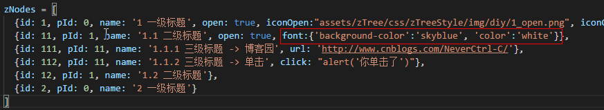 {id: 11, pId: 1, name: '1.1 二级标题', open: true, font:{'background-color':'skyblue', 'color':'white'}},