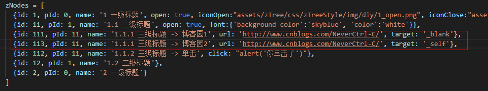 {id: 111, pId: 11, name: '1.1.1 三级标题 -> 博客园1', url: 'http://www.cnblogs.com/NeverCtrl-C/', target: '_blank'},