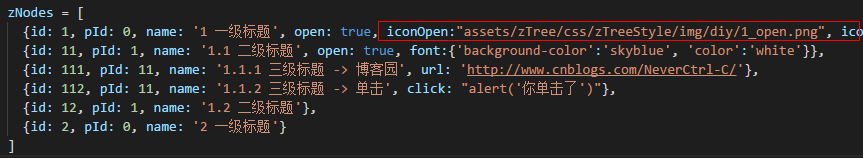 {id: 1, pId: 0, name: '1 一级标题', open: true, iconOpen:"assets/zTree/css/zTreeStyle/img/diy/1_open.png", iconClose:"assets/zTree/css/zTreeStyle/img/diy/1_close.png"},