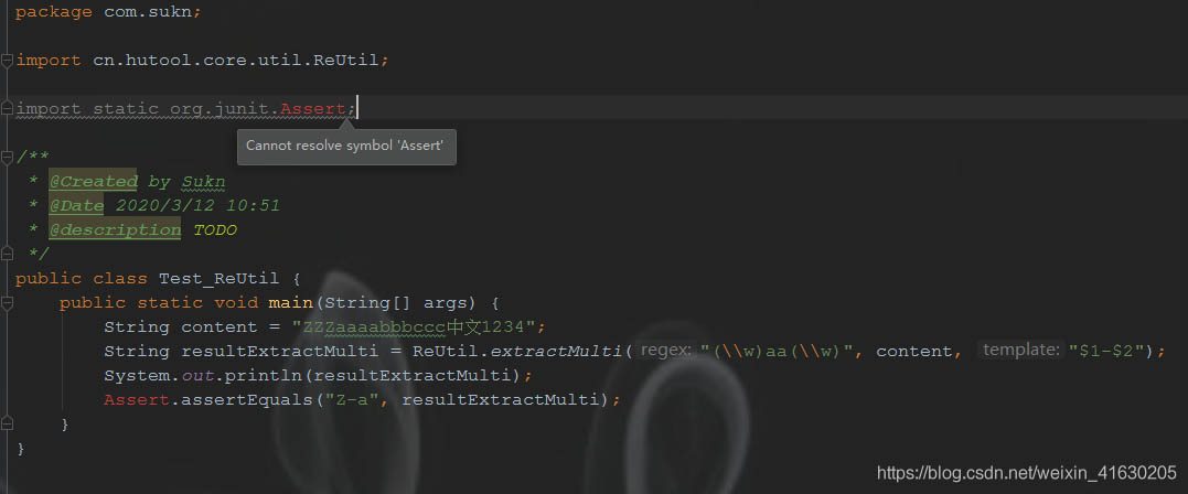 应该导org.junit.Assert而不是图中的cn.hutool.core.lang.Assert,但又出现了问题Cannot resolve symbol 'Assert‘