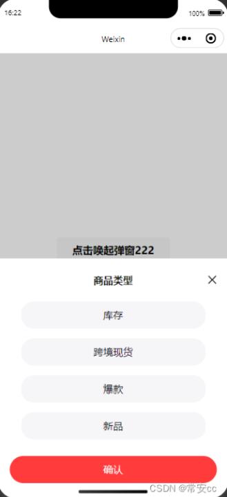 <!--index.wxml--> <view> <button style="margin-top: 300px;" catchtap="changeRange2">点击唤起弹窗222</button> <!-- 弹框 --> <dialogA id='dialog' catchtouchmove="preventTouchMove" bind:customEventHandler="customEvent"></dialogA> </view>