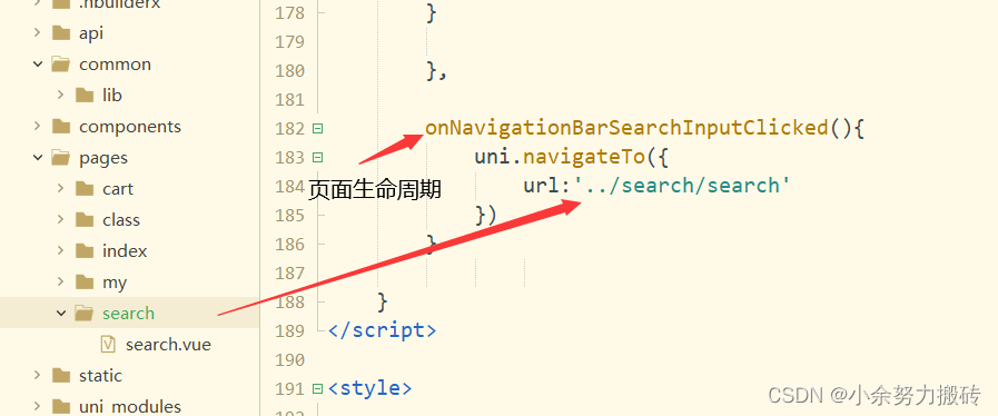 }}}为了达到跳转的效果,我要在页面同级创建文件夹,为搜索页面,我们要主页使用页面生命周期onNavigationBarSearchInputClicked(此次文件夹需要在pages.json中注册)