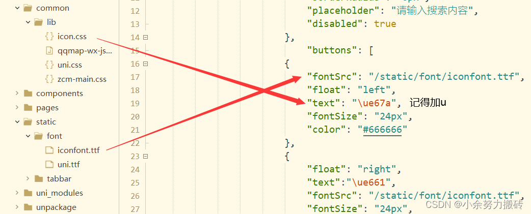 需要在pages.json中配置,可在button中添加,不过需要注意的是,不管添加文字,矢量图片,默认都是右浮动,可以把其中一个改成左浮动,这里我使用的是阿里巴巴矢量图库的图片,下载文件,引入即可有需要的小伙伴我可以免费提供一个文件夹。