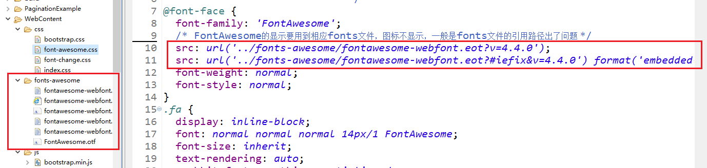 注意检查右边红框内的url是否对应左边红框内fonts-awesome文件的路径
