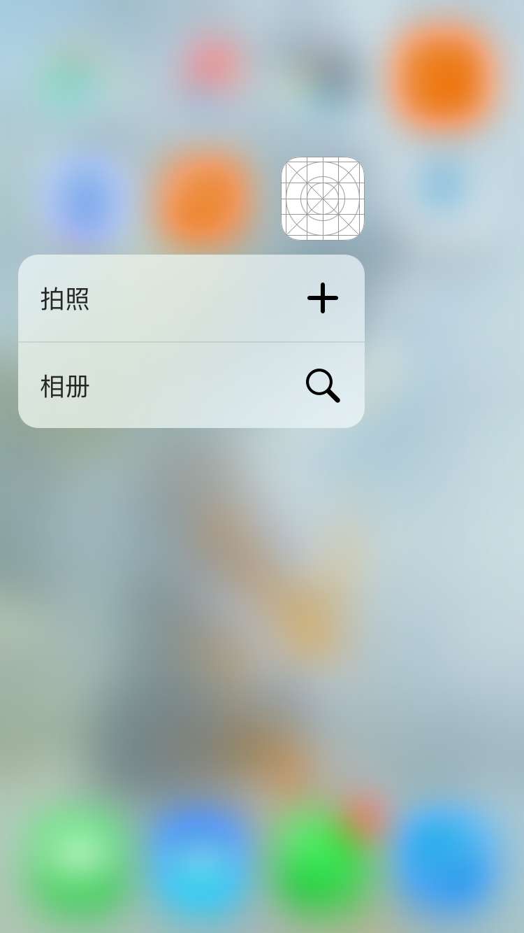 //给App图标添加3D Touch菜单 //拍照 //菜单图标 UIApplicationShortcutIcon *iconCamera = [UIApplicationShortcutIcon iconWithType:UIApplicationShortcutIconTypeAdd]; //菜单文字 UIMutableApplicationShortcutItem *itemCamera = [[UIMutableApplicationShortcutItem alloc] initWithType:@"1" localizedTitle:@"拍照"]; //绑定信息到指定菜单 itemCamera.icon = iconCamera; //相册 //菜单图标 UIApplicationShortcutIcon *iconPhotoLibrary = [UIApplicationShortcutIcon iconWithType:UIApplicationShortcutIconTypeSearch]; //菜单文字 UIMutableApplicationShortcutItem *itemPhotoLibrary = [[UIMutableApplicationShortcutItem alloc] initWithType:@"2" localizedTitle:@"相册"]; //绑定信息到指定菜单 itemPhotoLibrary.icon = iconPhotoLibrary; //绑定到App icon application.shortcutItems = @[itemCamera,itemPhotoLibrary];
