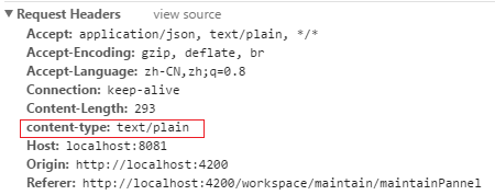 6.进一步查看请求头信息,content-type为text/plain。与Response Headers的Content-Type:application/json;charset=UTF-8类型不匹配,故报错。
