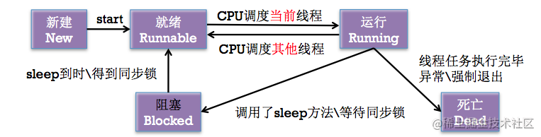 - 启动线程:进入就绪状态 -> 运行状态。当线程任务执行完毕,自动进入死亡状态