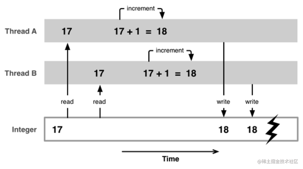 如上图:有2个线程A、B同时read同一个地址获得17,A进行加1得到18后写入,此时B将拿到的17进行加1得到18后再写入。 很明显的,17做了两次 1的操作,最后得到结果却是18!!! 对于这种多个线程访问同一对象获得的结果是不可以预期的就出现了安全隐患。 对此苹果官方也给出了解决办法:
