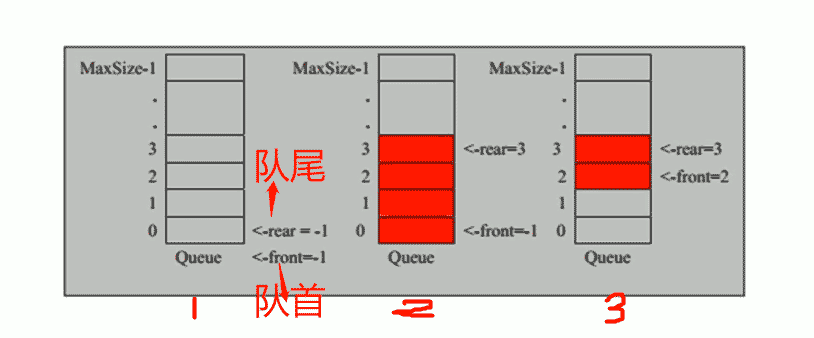 看一张队列的模拟图,1,2,3表示同一个队列Queue。在队列中有2个指针,front表示队首,rear表示队尾。