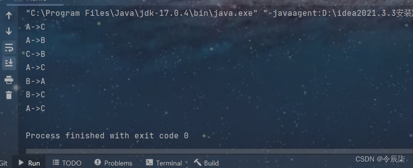 }代码解读:通过定义我们可以了解到每次只能移动一个盘子,并且小盘子要放在大盘子上面,那么这里我们有A B C,三个圆柱,我们可以将其依次理解为:初始位置 跳板位置 目标位置,我们看函数部分,如果只有一个盘子我们直接从A->C 只需移动一步便可,那么>1的情况,这里我们假设要移动三个盘子,通过画图我们可以发现首先要将2个盘子移动到B圆柱再借助A移动到C盘,那么这里的第一次调用 han(n-1,pos1,pos3,pos2);我们便可以理解,下次递归将(n-1)作为盘子个数,pos1就是我们的起始位置,pos3就是我们的跳板位置,pos2就是我们的目标位置,因为首先我们将(n-1)个盘子放在了B(pos2)上,调用结束后,执行我们的move函数,输出我们这次的移动轨迹,下次调用就是han(n-1,pos2,pos1,pos3);同理,这个时候pos2就是我们的起始位置,pos1变成我们的跳板位置,最后pos3是我们的目标位置。