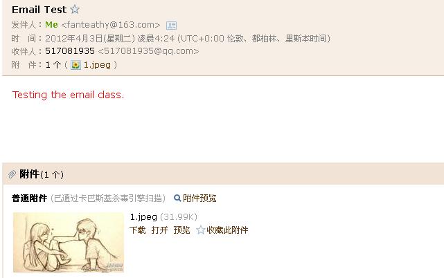 发送邮件。其中要注意如果添加附件时,附件的地址是相对CI根目录下的index.php的路径。运行结果如下: