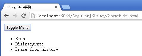 案例二:对于菜单、上下文敏感的工具以及很多其他情况来说,显示和隐藏元素是一项核心的功能。与Angualr中其他功能一样,Angular是通过修改数据模型的方式来驱动UI刷新,然后通过指令把变更反应到UI上。