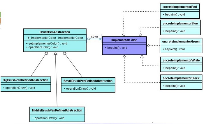 实际上,蜡笔和毛笔的关键一个区别就在于笔和颜色是否能够分离。即将抽象化(Abstraction)与实现化(Implementation)脱耦,使得二者可以独立地变化"。关键就在于能否脱耦。蜡笔的颜色和蜡笔本身是分不开的,所以就造成必须使用15支色彩、大小各异的蜡笔来绘制图画。而毛笔与颜料能够很好的脱耦,各自独立变化,便简化了操作。在这里,抽象层面的概念是:"毛笔用颜料作画",而在实现时,毛笔有大中小三号,颜料有红绿蓝黑白等5种,于是便可出现3×5种组合。每个参与者(毛笔与颜料)都可以在自己的自由度上随意转换。