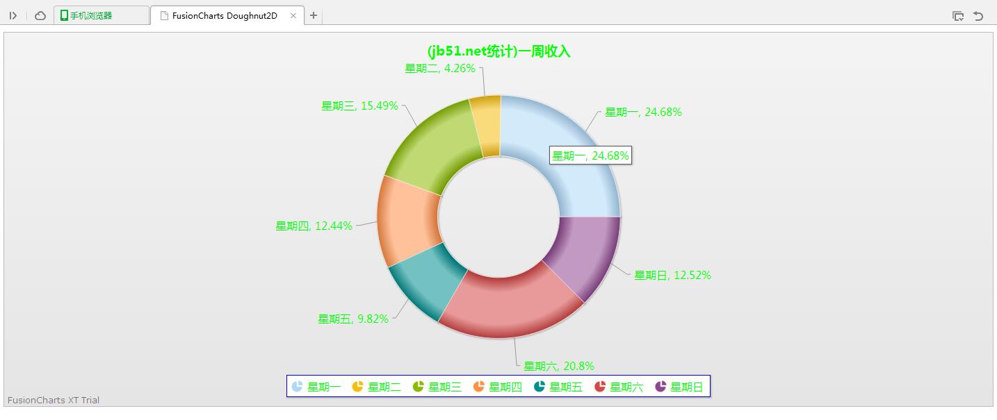 <chart caption='(jb51.net统计)一周收入' showPercentageValues='1' baseFont='微软雅黑' baseFontSize='16'