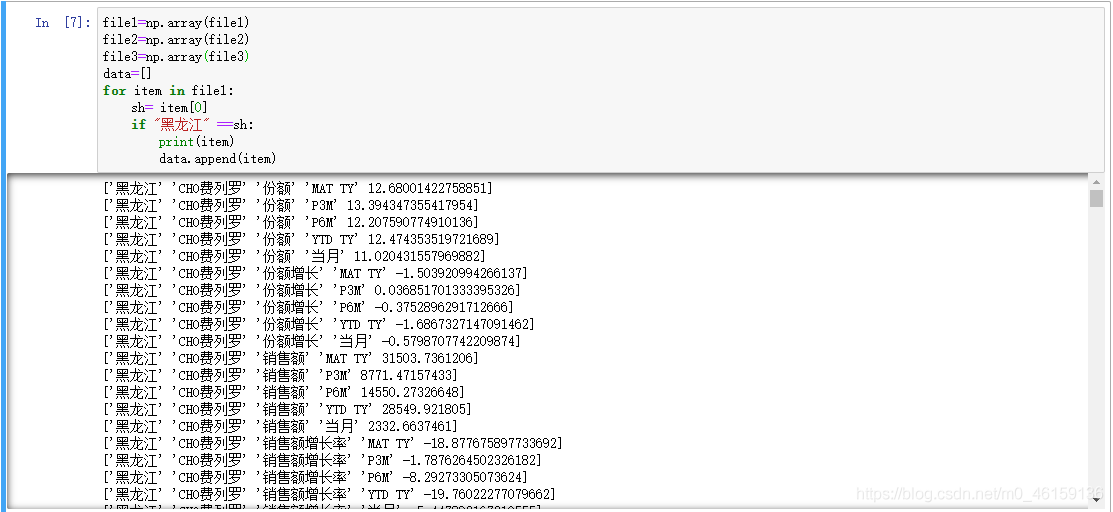 我们将所有省份是‘黑龙江’的数据挑选出来,并放入新的数组中