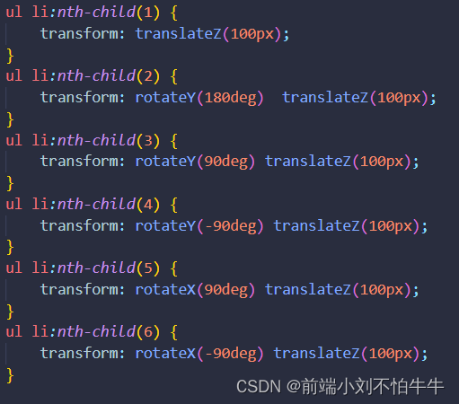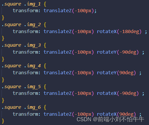 rotateX就是以X轴为对称中翻转,朝上为正,朝下为负,Y同理 - 这里设置translateZ,简单理解就是把页面文档流看作地面,这里设置图片的高度, 全部设置为100px是为了让图片在一个高度,构成封闭魔方