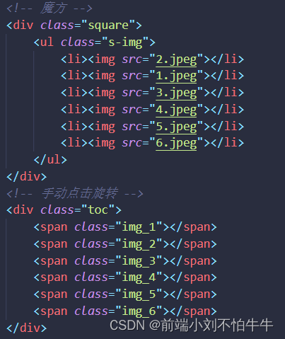 - 当我们对下方图片触发点击事件时,通过JS给魔方的ul加相对应类名,类名对应设置了transform样式,也就实现了点击触发相对应的魔方旋转