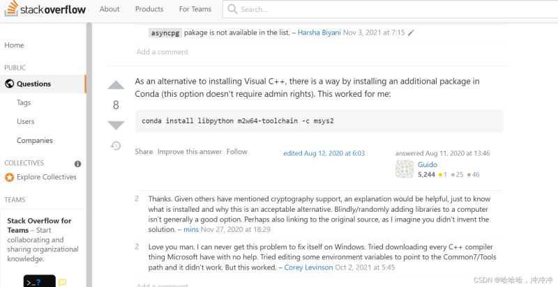 6.如果网上的一些中文教程解决不了问题,可以试着在谷歌上搜一下,那里一般技术答疑更多一点,比如我的这个问题就是在:https://stackoverflow.com/questions/44951456/pip-error-microsoft-visual-c-14-0-is-required 这个网址搜到的(不是我想出来的,我只是个菜鸡)