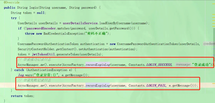 recordLoginLog方法返回的是TimerTask定时任务类,将用户登录信息记录到日志中作为一个定时任务,交给定时任务调度线程池scheduledExecutorService,scheduledExecutorService通过在异步任务管理器类中,用getBean()从IOC容器中获取。