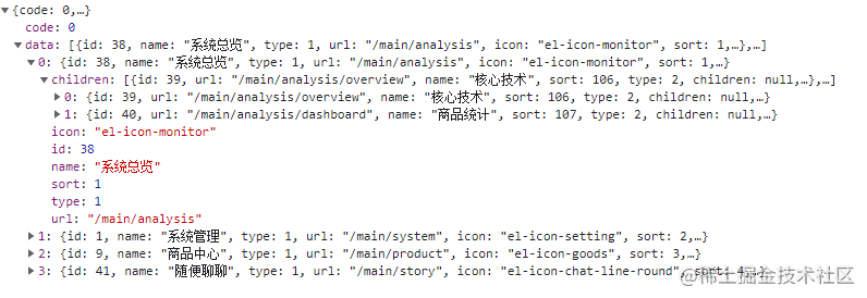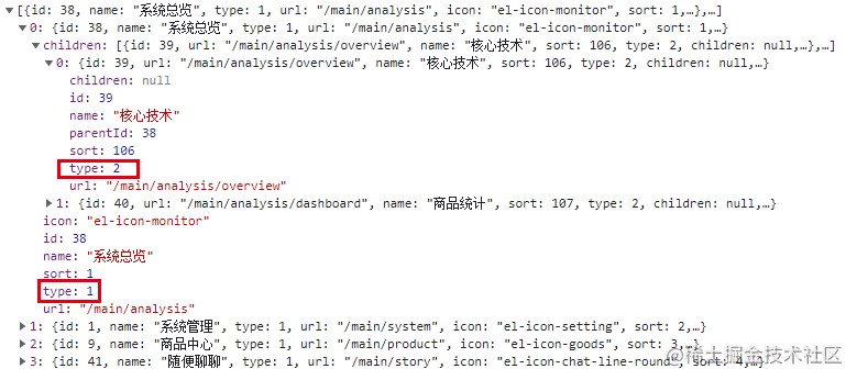 可以看到,返回的userMenus是一个数组,包含了图标icon、路由名称name、路由地址、子路由children、路由type等重要信息。前面这些信息主要是用于遍历生成页面左侧的菜单列表,路由type则是用于后面筛选出需要挂载在router上的路由列表。