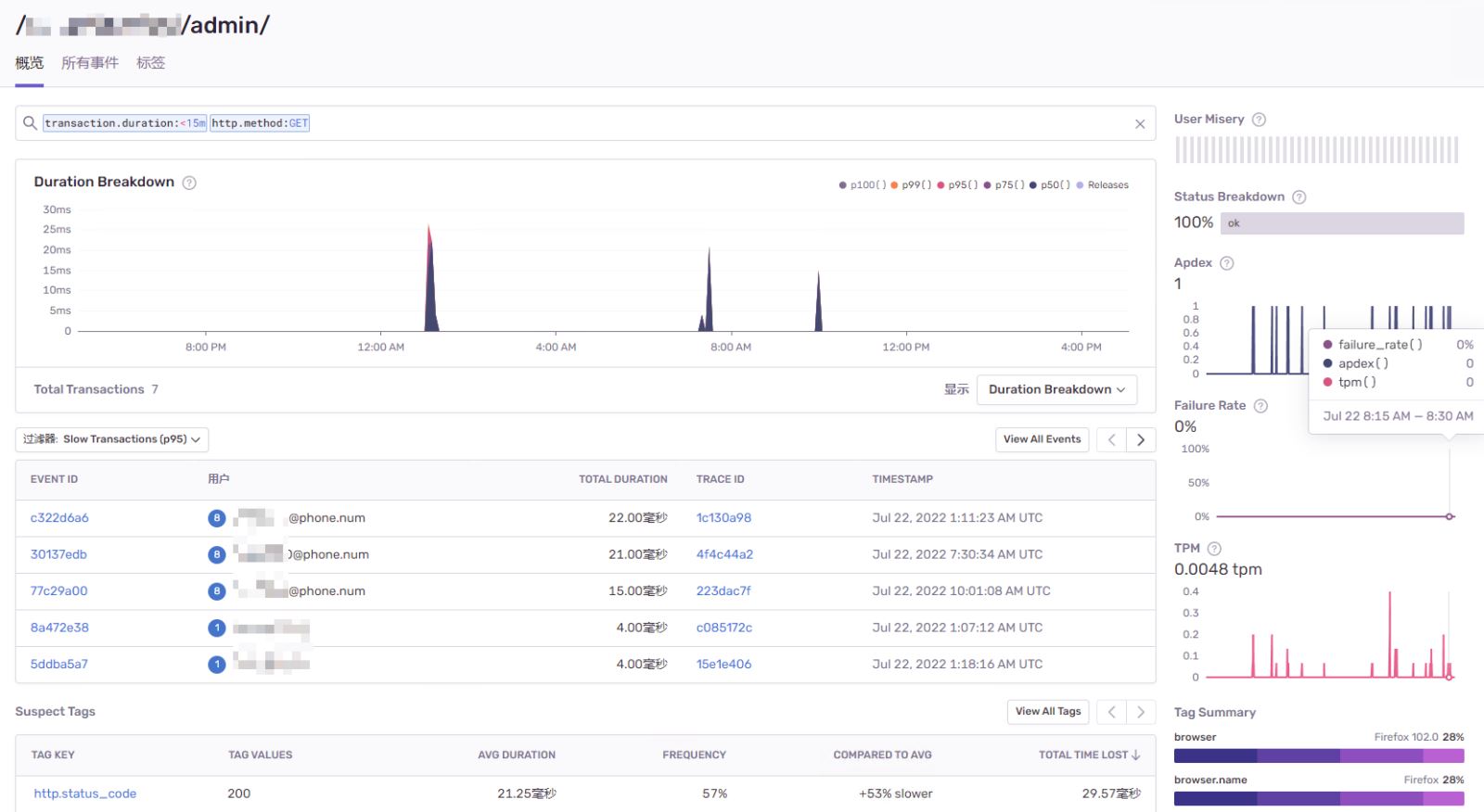 然后再点进去某一个URL还能看到访问这个URL的用户的一些信息,包括IP地址,用户名(如果已登录),页面停留时间,用户都是哪些时间段访问啥的,指标太多了,有些不太懂,反正功能是很强的就对了~