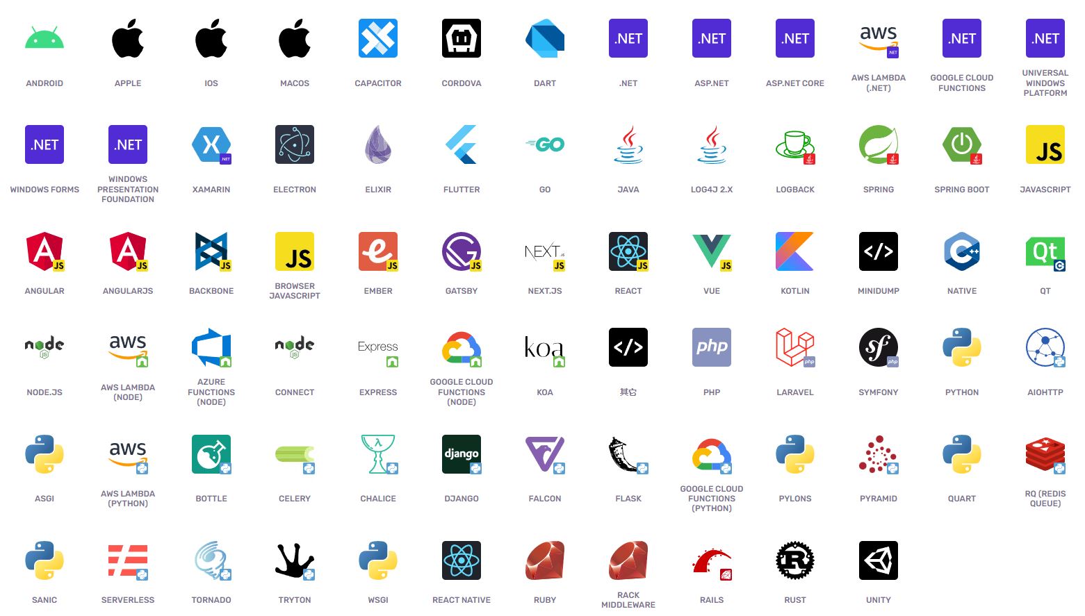 Sentry使用Python(Django)开发,功能非常丰富,相比起ExceptionLess来说也重得多(这也是我们在.NetCore平台使用ExceptionLess的原因),其支持的平台很全,基本主流编程语言/框架都有,看图