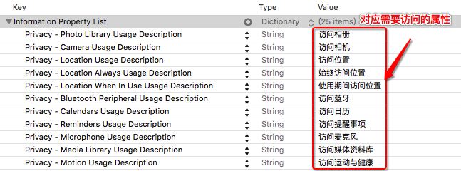iOS 10 开始对访问用户隐私权限更加严格,如果你不设置就会直接崩溃,解决办法都是在info.plist文件添加对应的Key-Value就可以了。