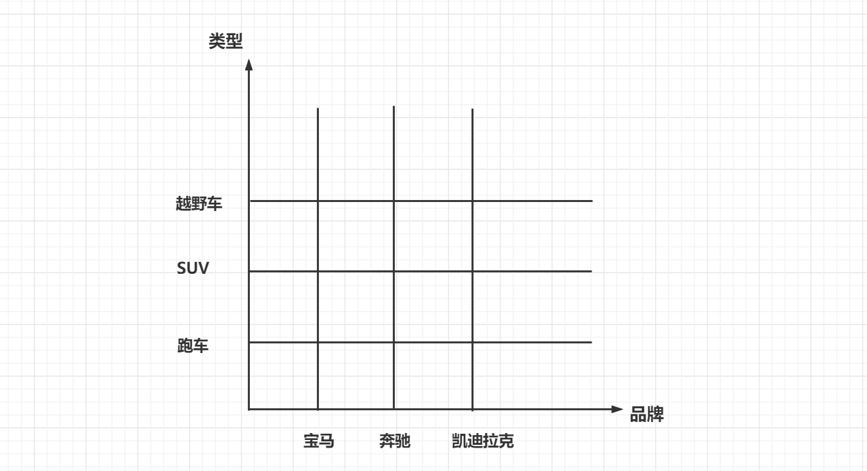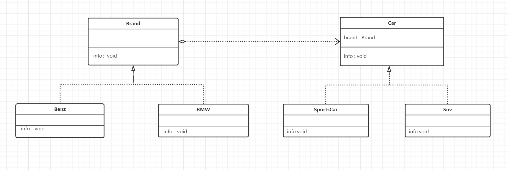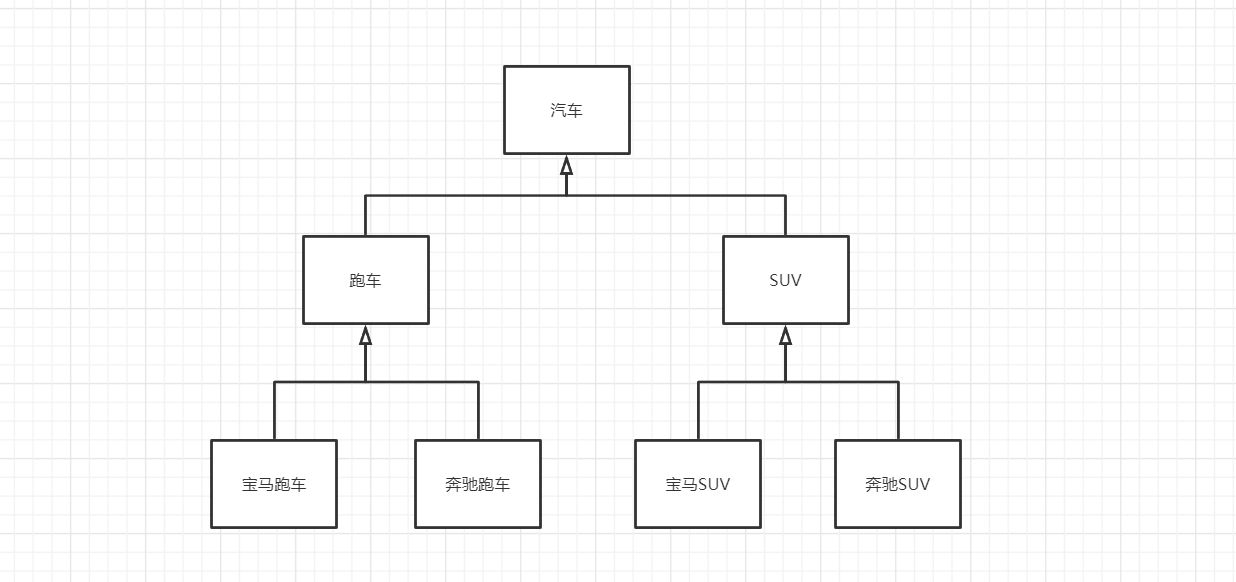 当用户采用多继承的方式实现代码时,增加一个新的种类非常不方便(可拓展性差)。如上图,我想增加一个奥迪类,则需要在跑车中增加奥迪跑车类,在SUV中增加奥迪SUV类,这仅仅是两个,如果是多的话会更加的麻烦。
