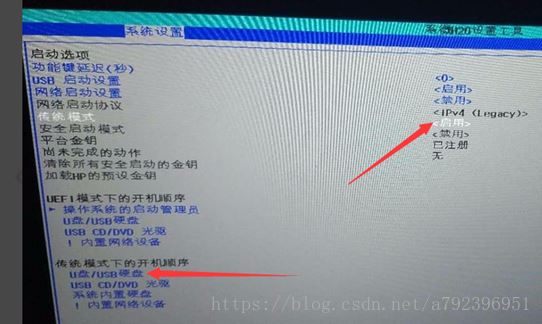 3. 在启动选项里有一个“传统模式”默认是禁用的,把它改成启用,并且把“传统模式下的开机顺序”下面的“U盘/USB硬盘”通过键盘调到第一个,修改完成后记得按“F10”保存并退出。