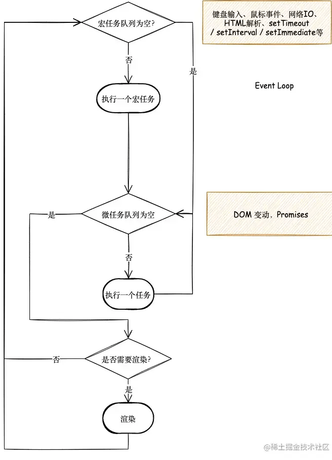 - 宏任务:script(整体代码)、setTimeout、setInterval、I/O、UI 交互事件、setImmediate;需要特定的异步线程去执行,有明确的异步任务去执行,有回调。