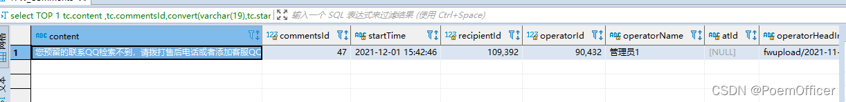 left join zd_opt zo1 on zo1.AID = tur.recipientId where tmr.commentsId = 47查询结果