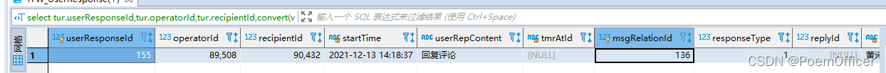 left join zd_opt zo1 on zo1.AID = tur.recipientId where tmr.commentsId = 136 and tmr.replyId = 155查询结果