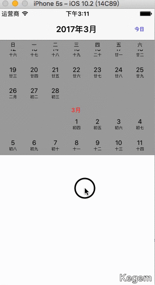日历一般都是用UICollectionView进行开发的,相关demo也很多,这里就讲一个我最近写的玩的demo,由于时间原因没来得及加年历和周历,一个月历的小demo,随着月份天数的不同,自动改变日历的高。