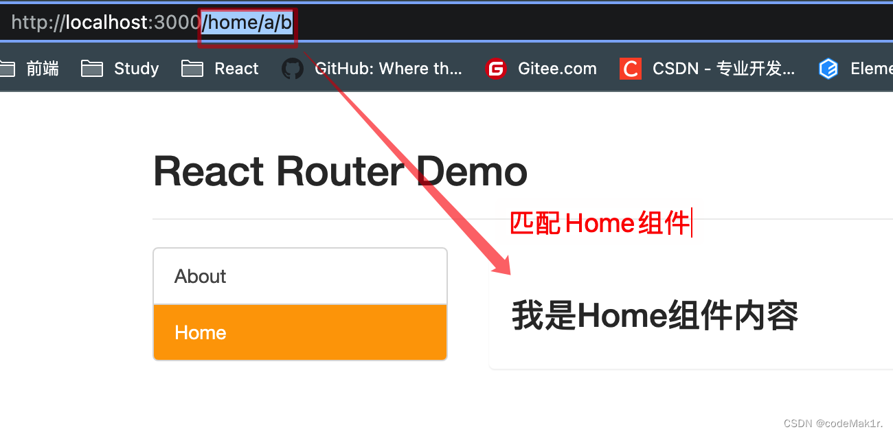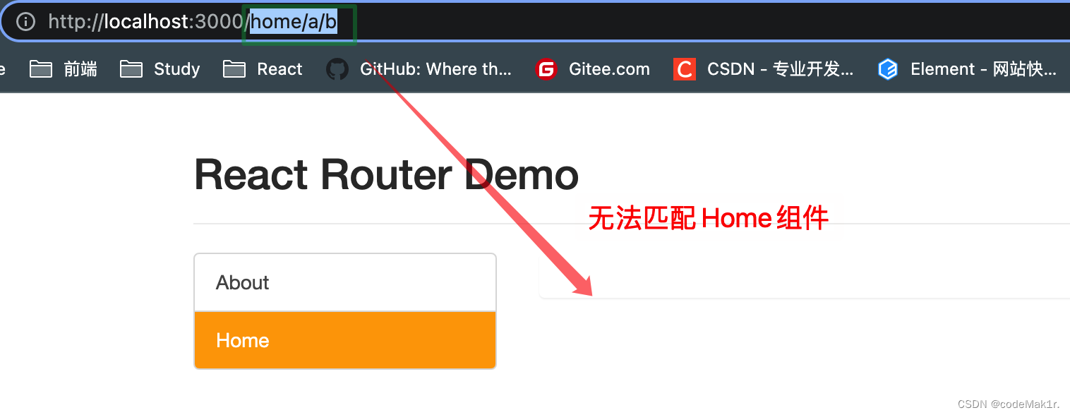 此时,点击Home,进入路径/home/a/b,无法匹配/home路径下的{Home}组件。