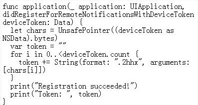 首先检查用户授予权限,然后调用该方法注册远程通知。当请求完成后者将调用另一个代理方法。这个方法响应包含一个device token,你可以打印进行调试。在发送推送通知来识别设备需要这个device token。