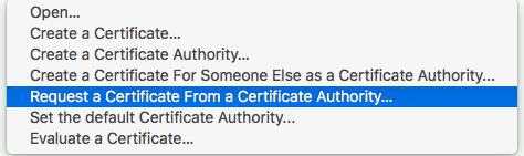 去创建一个证书,打开Keychain Access,从证书认证菜单中选择Keychain Access -> Certificate Assistant -> Request a Certificate。