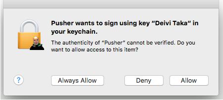 下载并运行Pusher。这个程序的顶部需要填入一个推送的证书。为它位于你的钥匙链,OS X将询问是否允许Pusher访问证书。