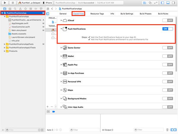 当您已经创建了project,去Project Settings页选择Capabilities栏。打开推送通知,如下所示。