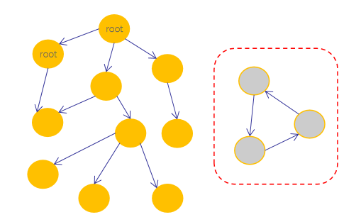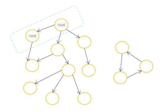 此时,虽然虚线框内部的对象之间仍然存在相互引用的关系,但是这些对象同样是不可达的,并会被垃圾回收机制删除。这些节点已经和根脱离了关系,变的不可达。
